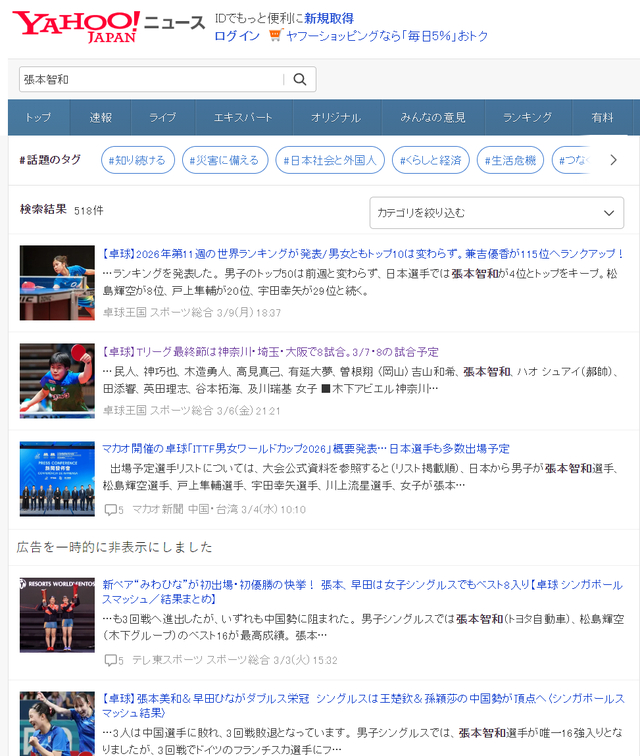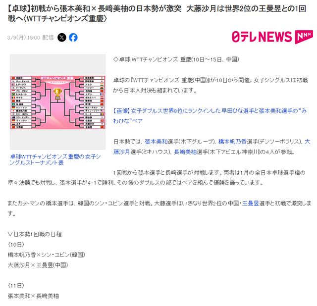 在日媒搜刮张本智和的名字也没有关在重庆站的动静,最新的动静就是WTT最新的世界排名跟张本智和有关,很较着日媒也不再继续看好这位日乒一哥。